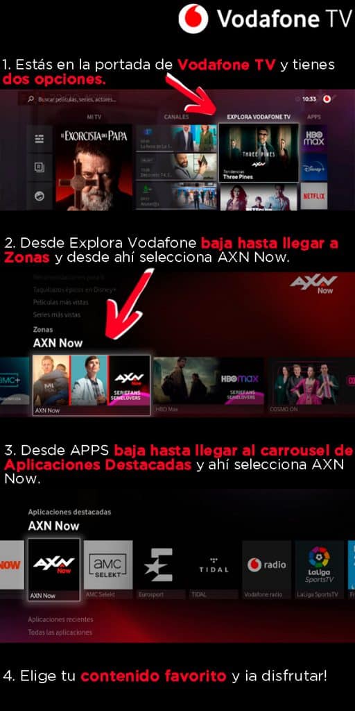 Si tienes AXN, ¡tienes AXN NOW! El servicio está disponible en las principales plataformas de televisión de nuestro país. Algunos ejemplos de navegación: